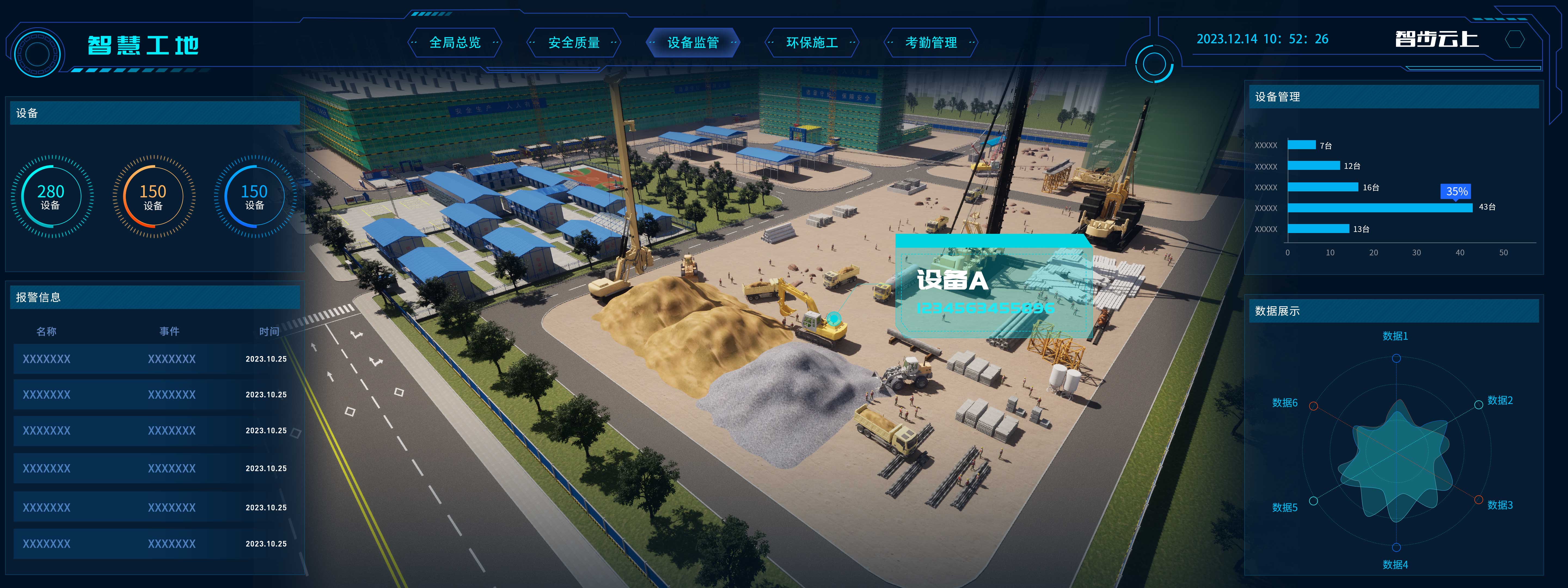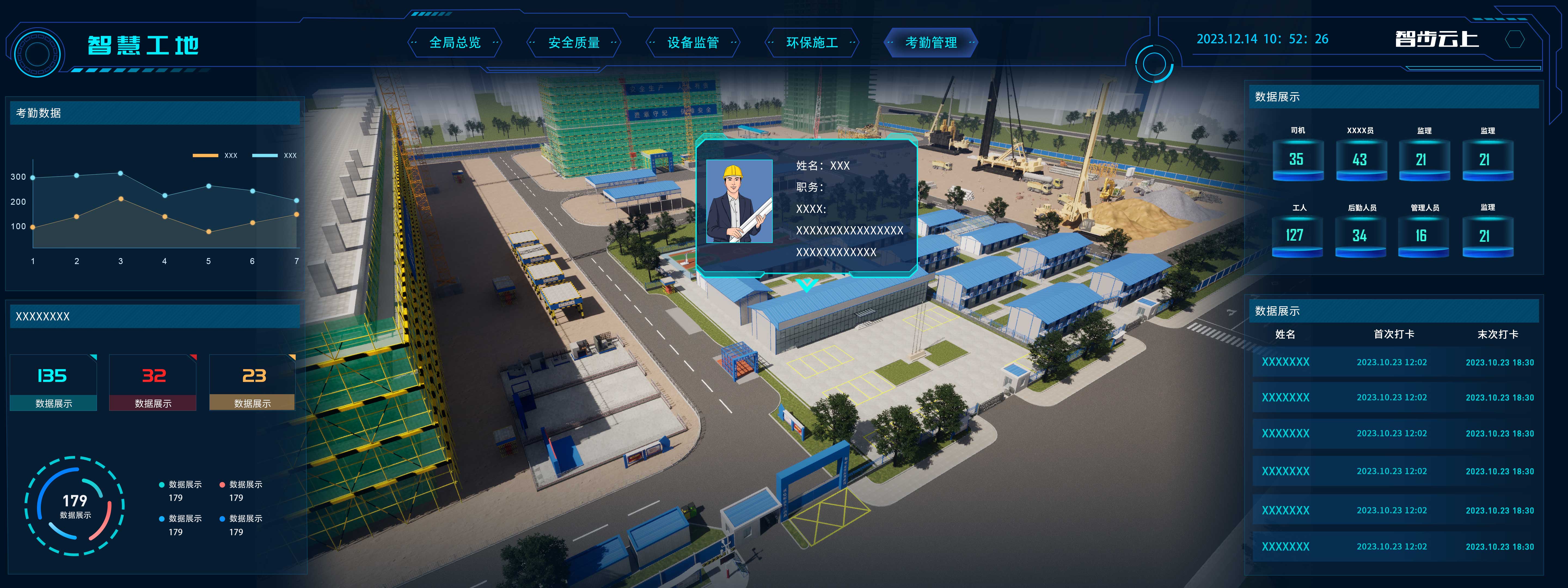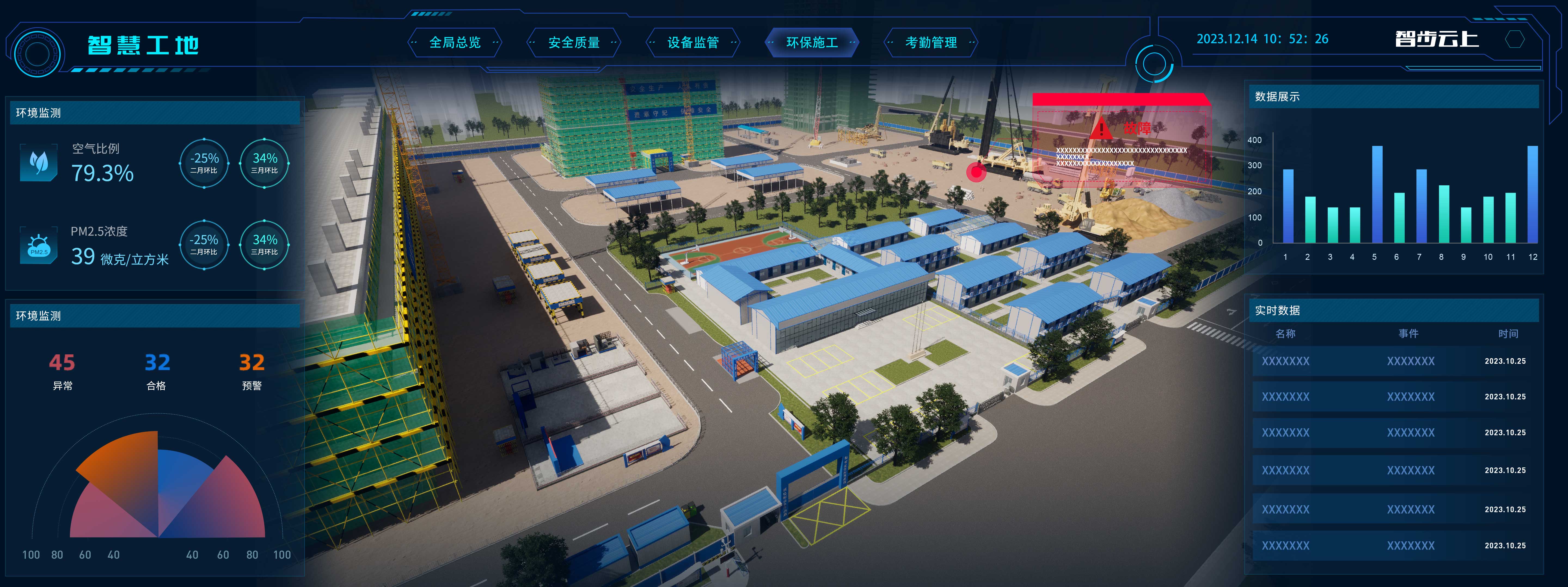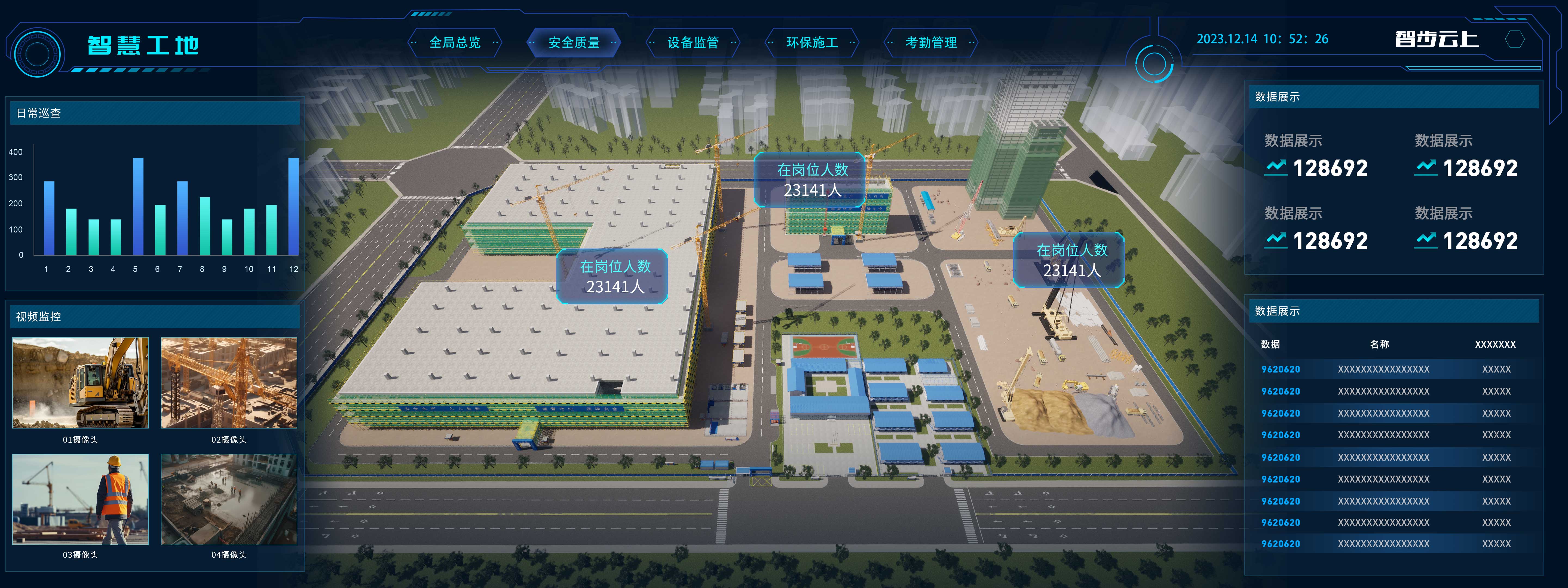 日常安全檢查,隱患分析,重大風險監控,***人員定位安全防護,日常質量巡查,電子留底保存,實現安全質量在線防控。智慧工地可視化大屏需要可以將工地各個關鍵區域的攝像頭畫面實時展示在大屏幕上,以便***掌握工地安全狀況和生產進度;工地可能存在各種安全風險,通過將安全警報和預警信息與大屏幕相連接,可以及時報警并展示在大屏幕上,以便工地管理人員及時采取應對措施。